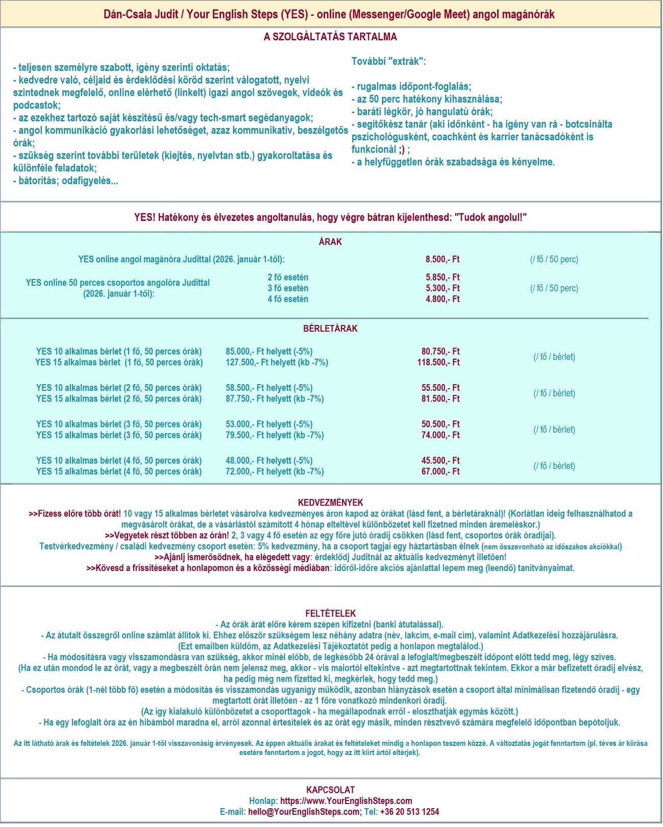 Az órai kommunikáció szinttől függően 85–100%-ban angolul zajlik. Törekszem arra, hogy minél hamarabb természetesebbé váljon az angol használata, miközben a szükséges nyelvtani és szókincsbeli alapokat is tudatosan fejlesztjük.